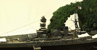 The Nagato is finished .I decided to squeeze in one corner a steep cliff , typical of some Asian island as Nagato is trying to find some shade next to it.Probably too close for comfort but this was a last minute decision and the base wasn't really designed to accommodate that.However the green cliff is giving more color and life (note the small flowers with touches of white, yellow, red).